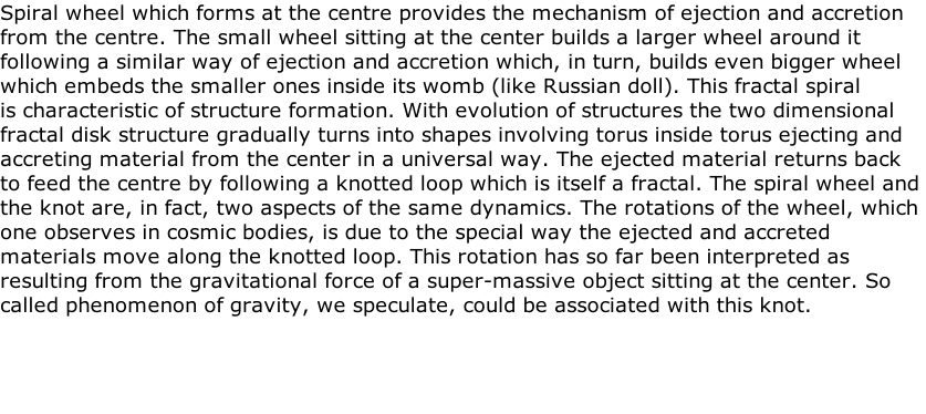 This process of creation and evolution is supported by dark structures which supply building materials. In fact the foundation of the wheel seems to exist in the background world from where much larger structures of dark matter guide the development of the luminous universe.